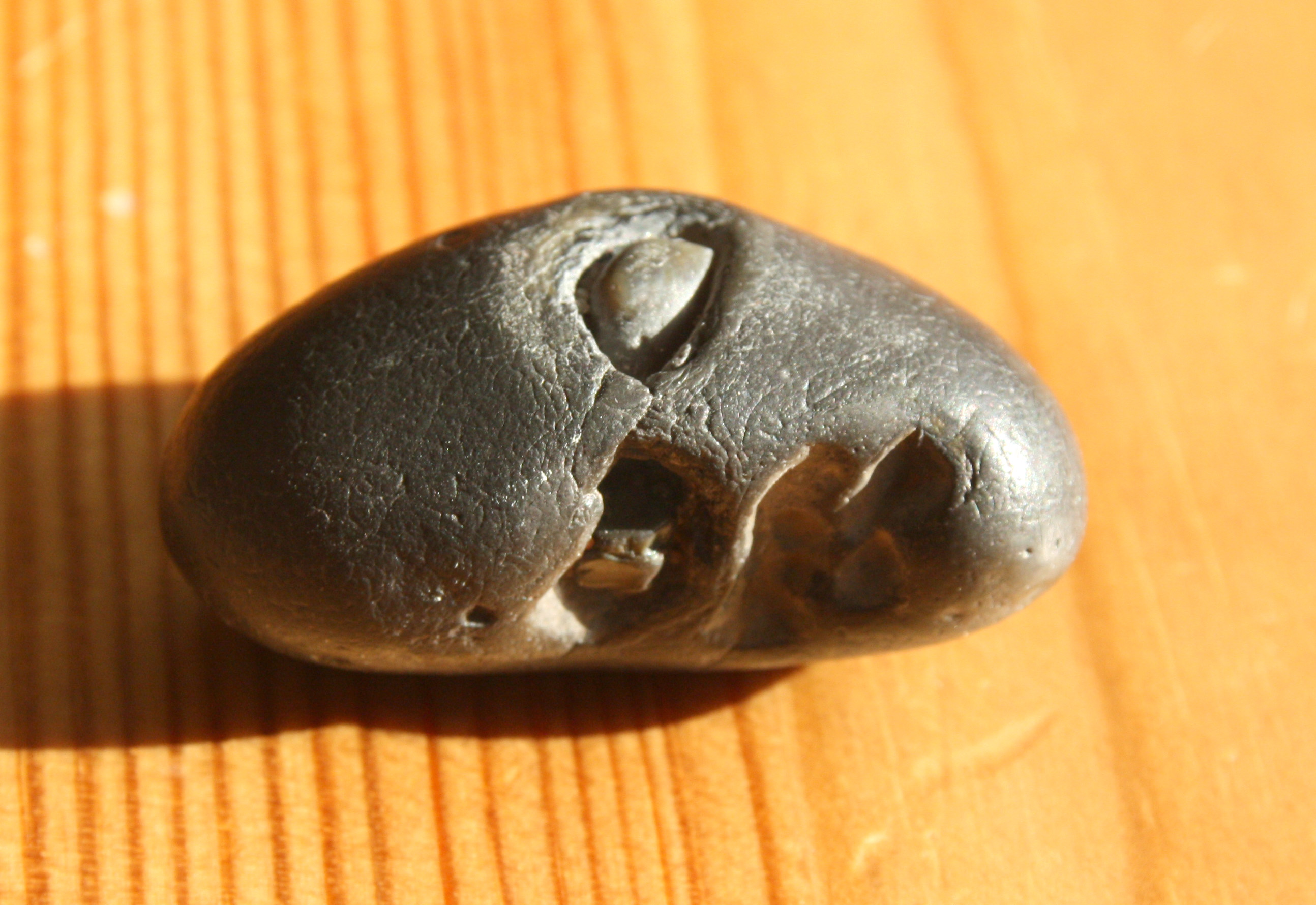 Beim Spaziergang an unserem Hausbach (Strom Moers), habe ich diesen "Kiesel" gefunden. Er hat einen merkwürdigen Einschluß und die Kerben sehen aus, als wären es die Spuren von Zähnen. Die Abbildung sagt jetzt wenig über die GRöße des Steins aus, er mißt in der Länge 42 mm.