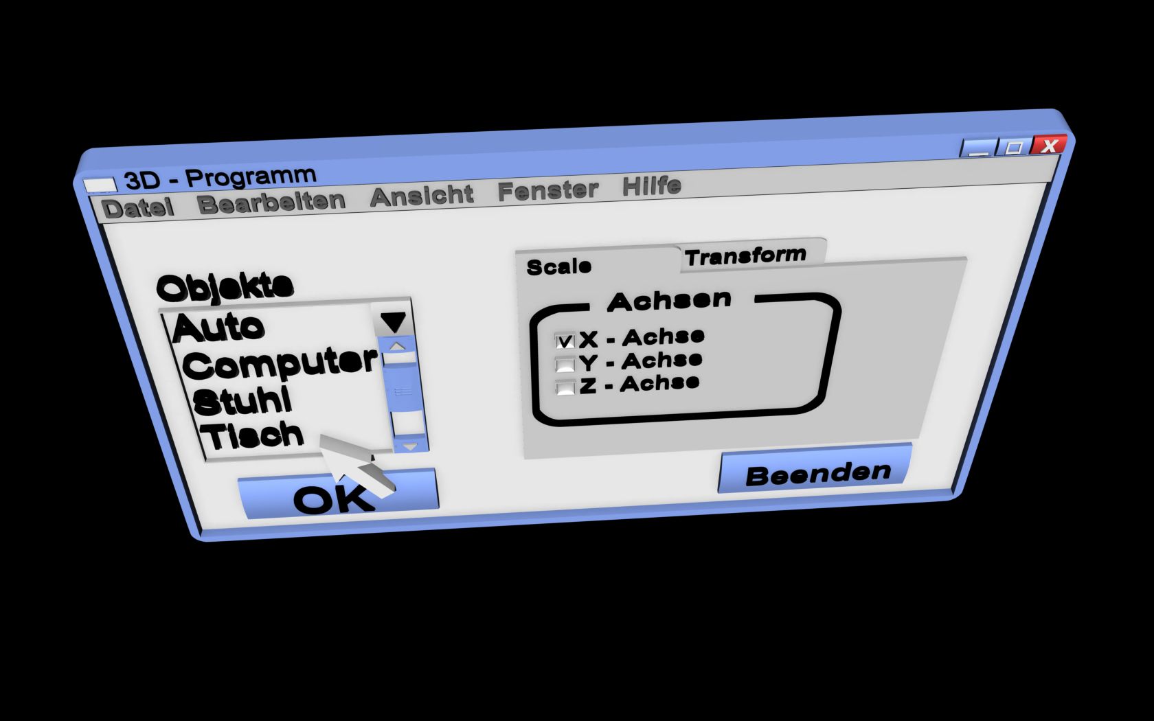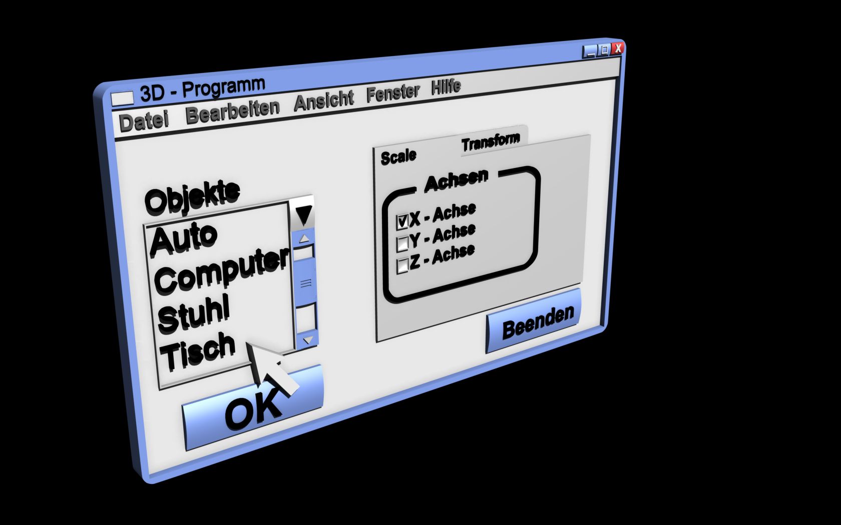 Hier mal eine Bastelei die aus langer Weile entstanden ist ein 3D-Programm im doppelten Sinne. Vielleicht könnte so ja dann Windows 10 aussehen, mal Microsoft den Vorschlag machen. :D:D:D:D