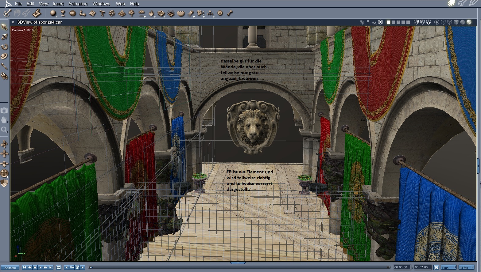 Nachdem ich die mitgelieferten Bumpmaps in die einzelnen shader-Elemente nachträglich eingesetzt habe, stimmt fast alles.(Bild 3) Nur an den Gesimsen treten Fehler auf (Bild4) als wenn in einzelnen Bereichen die zugehörige Normalmap umgekehrt wäre. Ich habe im Modeller ( Bild5) versucht, die Polygon Normals umzukehren, aber das hat nichts gebracht.