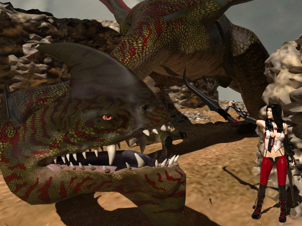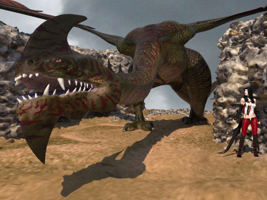 - bei meinem "Opfer für den Drachen"-Bild sieht Du zwar den Bauch nicht in der Totalen, aber doch ansatzweise: die Texturen laufen da normal zusammen.Ist auf Deinem Bild ja auch nicht die einzige Stelle an der die Texturen vom Drachen nicht passen, schau mal an der "linken Schulter", dem Überganz zur Schwinge und am Beinansatz. Da hat der Render etwas nicht richtig umgesetzt denke ich mal - irgendwie fehlt da auch die Struktur, hat er die Bump-Map nicht umgesetzt?