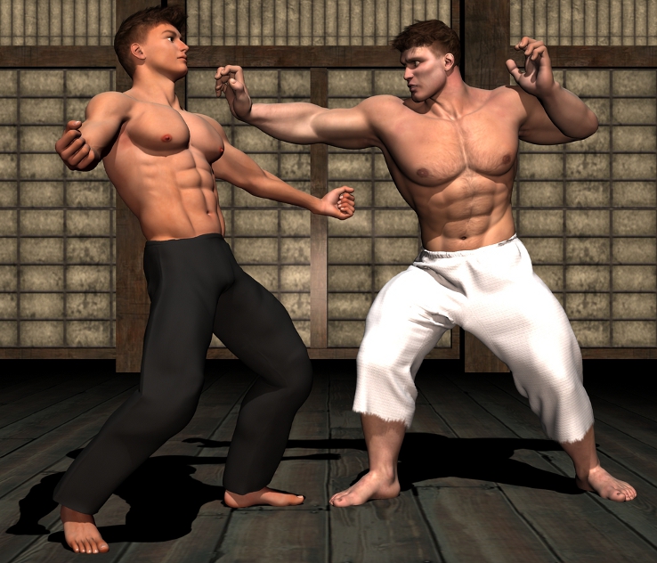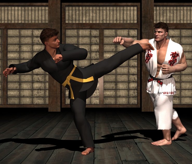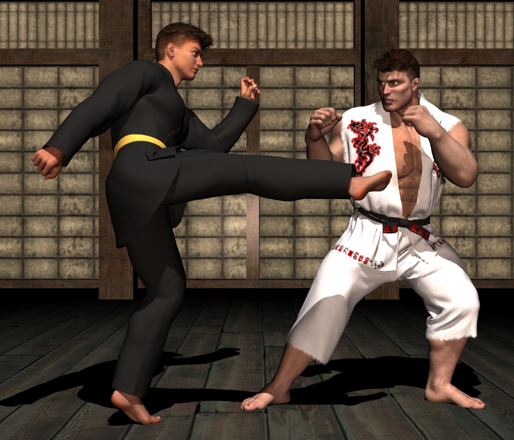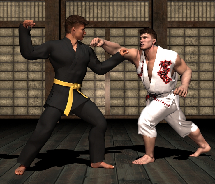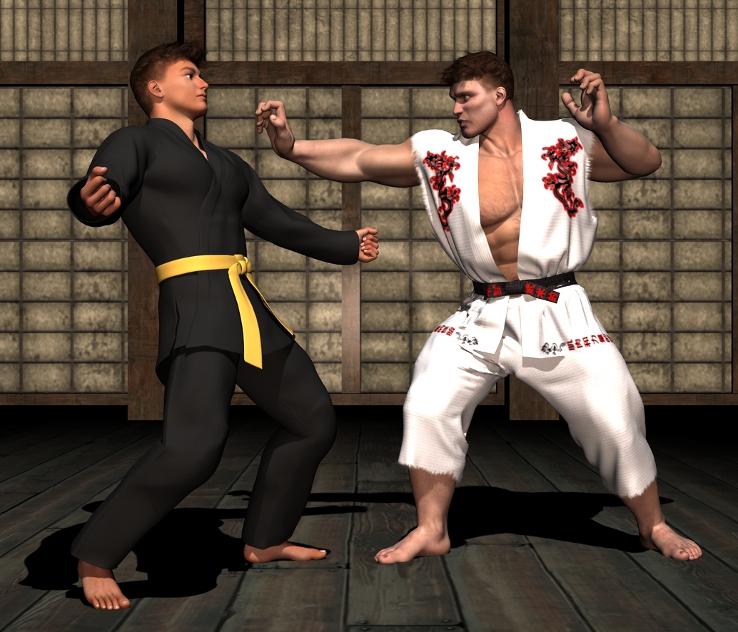• Verwendete(s) Programm(e): DS3, Dynamic-Clothing-Control, M4 (mit Karate-Kleidung (DAZ)) + F4 (Martial Arts Gi, DAZ, Dynamic Clothing), Free Dojo (Sharecg).