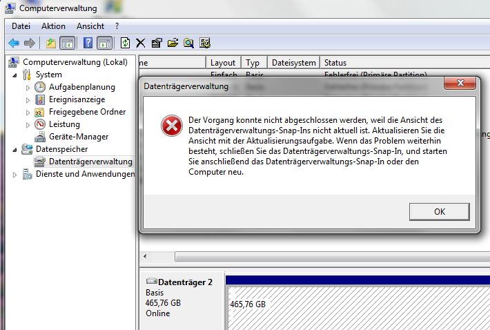 Wenn ich in der Datenträgerverwaltung dann per Rechtsklick auf den Datenträger (hier 2) klicke, erhalte ich immer wieder die Fehlermeldung, dass das "Datenträgerverwaltungs-Snap-In" nicht aktuell sei - siehe Bild.