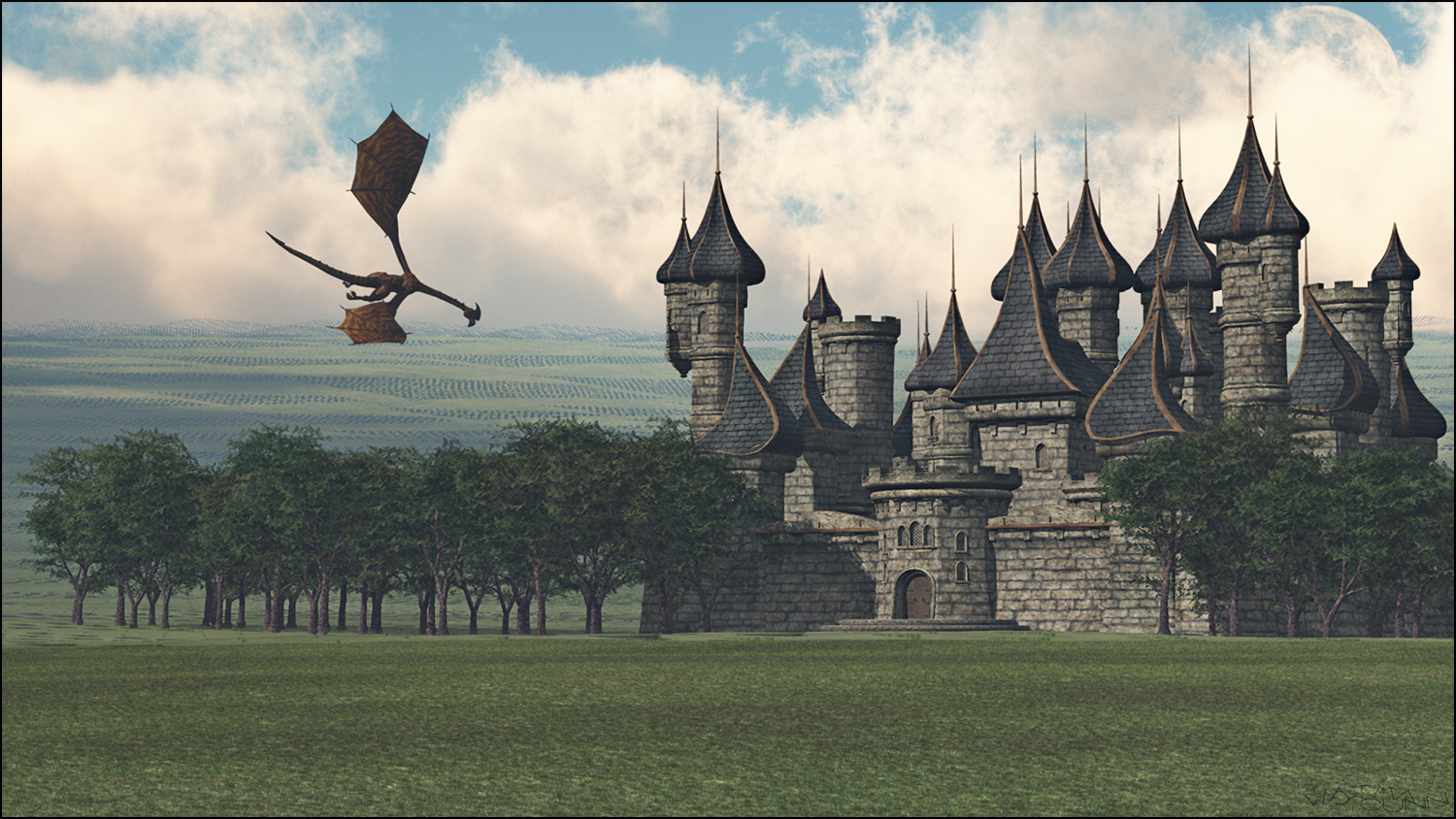 Das ist also mein erster Render mit Vue, die Bäume sind von Hand hingeschoben, der Boden sollte eigentlich vom Ecosystem bewuchert sein (da muß ich nochmal mit experimentieren - gerade im Hintergrund sieht das aus wie Felder :P ), das Schloß hab ich in DAZ zusammengeschustert und als OBJ gespeichert/importert, der Drachen ist eine importierte Poser-Szene.