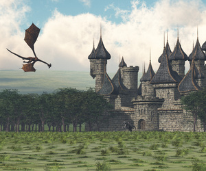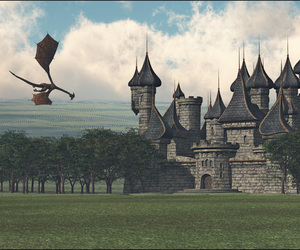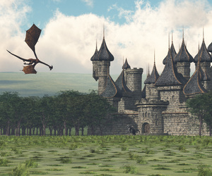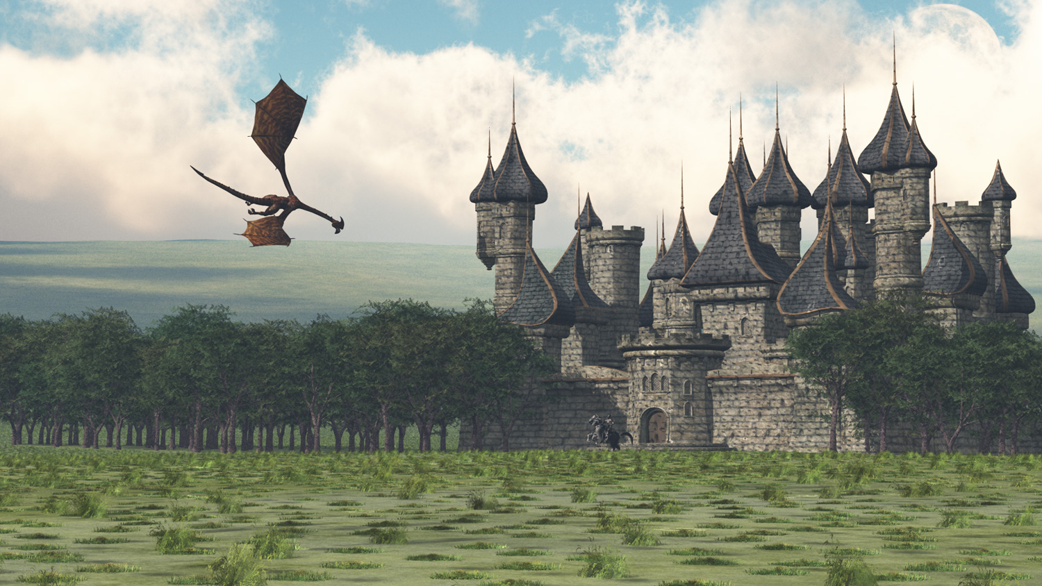 Das ist also mein erster Render mit Vue, die Bäume sind von Hand hingeschoben, der Boden sollte eigentlich vom Ecosystem bewuchert sein (da muß ich nochmal mit experimentieren - gerade im Hintergrund sieht das aus wie Felder :P ), das Schloß hab ich in DAZ zusammengeschustert und als OBJ gespeichert/importert, der Drachen ist eine importierte Poser-Szene.