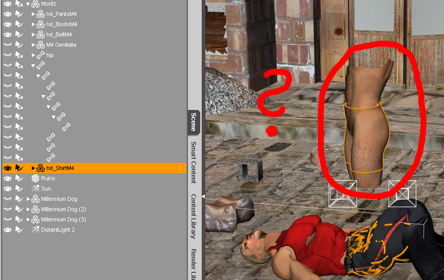 Deshalb habe ich die Szene in DS4 geladen - und habe plötzlich einen 2. Teilkörper für die M4-Figur. Ich kann den nicht markieren. Ich habe schon sämtliche Knoten durchprobiert, aber die Figur ist starr und lässt sich nicht unsichtbar machen.