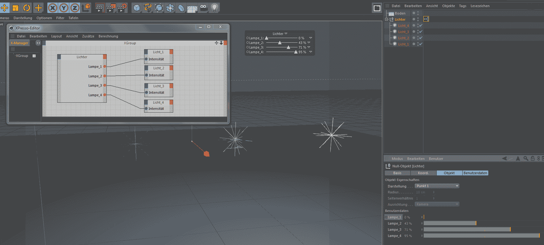 Ich bin neu hier und noch Neueinsteiger. Jetzt habe ich eine Leuchte und einen Dimmer modelliert. Über XPRESSO (damit fange ich gerade an) bewege ich den Schieberegler und verändere damit die Intensität des Lichtes. Dazu verwende ich Benutzerdaten in einem Null-Objekt, die ich über HUD einblende. Das funktioniert alles.