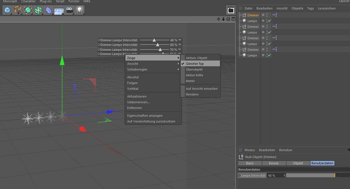 Ich bin neu hier und noch Neueinsteiger. Jetzt habe ich eine Leuchte und einen Dimmer modelliert. Über XPRESSO (damit fange ich gerade an) bewege ich den Schieberegler und verändere damit die Intensität des Lichtes. Dazu verwende ich Benutzerdaten in einem Null-Objekt, die ich über HUD einblende. Das funktioniert alles.