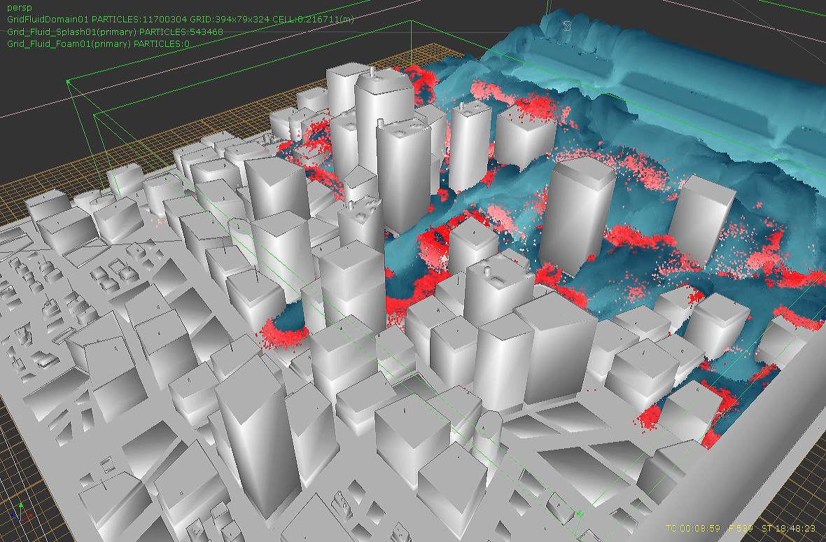 Finde das Thema interessant und evtl. versuche ich, ein Tsunami-Cityflood-Projekt etwas auszuarbeiten. Dies wäre grundsätzlich das Konzept als Simulation, aber ob's was wird hängt vom Realismus in der finalen Form ab, und das ist gar nicht so einfach und ziemlich zeitaufwendig. Die City-Struktur ist aus Cinema4D mit dem Citygen-Plugin gemacht und die Welle plus rote Gischtpartikel aus RealFlow: