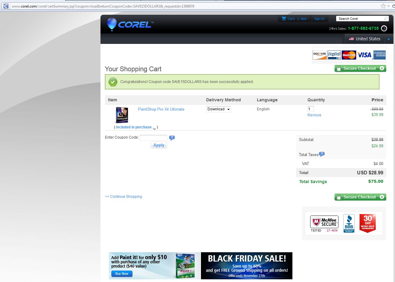 Ich hab das ganze im US Corel Shop nachvollzogen (oben rechts die Ländereinstellung gewechselt) und habe Corel Paint Shop Pro X4 (nicht Ultimate) für USD 17.39 erstanden. Mit Verwendung des SAVE15DOLLARS Coupon Codes. Die version ist natürlich die englische, mit etwas Glück könnte der License Code auch eine deutsche Version freuschalten - einen Versuch wär das schon wert.
