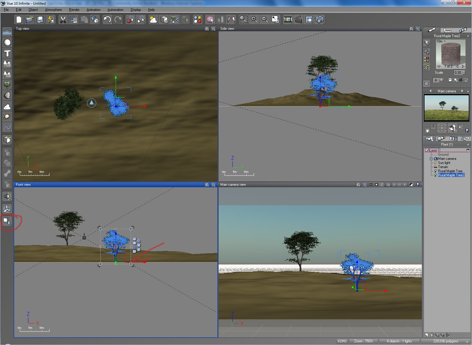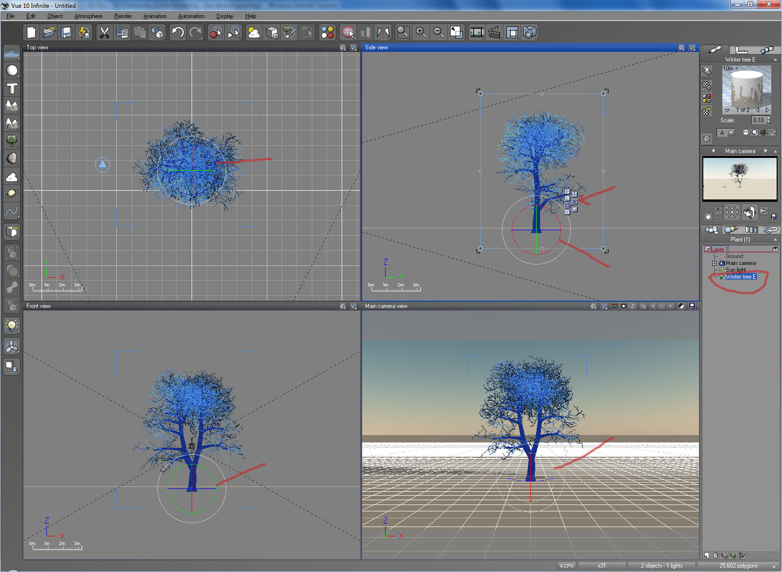 In meinem Screenshot hier siehst Du den nichtmarkierten Baum, der schon auf dem Gelände steht und den markierten, den ich grade neu geladen habe und der auf der Grundfläche steht und noch gehoben und auf das Gelände fallengelassen werden muss.