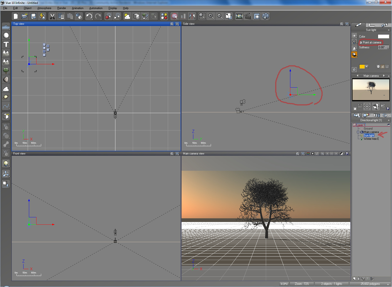 Die Sonne kann man entweder auf die gleiche Art und Weise wie jedes andere Objekt drehen und wenden, also rechts im Fenster markieren und dann in einem der Ansichtsfenster hoch und runter oder nach vorne und hinten schieben - oder eben über die Zahlenwerte im Atmosphereneditor. In einer neuen Szene ist das Häkchen oben an, d.h. die Sonne zeigt immer Richtung Kamera, egal wo sie steht.