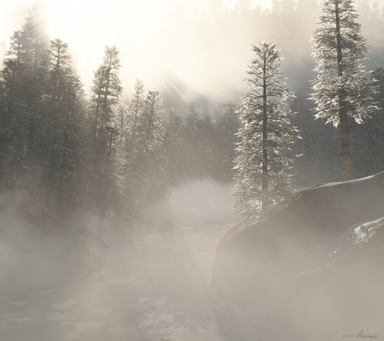 Das einzige, was mir verrät, dass es kein Foto ist, sind die etwas zu scharfkantigen Schatten der Bäume, die müssten bei dem Nebel doch eher weich sein? Aber sonst wirklich absolut genial! -