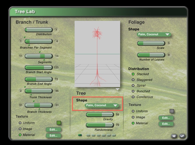 Hole ich den Baum aus der Leiste ondem ich auf „tree“ klicke habe ich irgendeinen Baum in der Szene. Den kann ich zwar über das „E“ editieren aber wenn ich z. B. eine Palme haben will so muß ich hier erst wieder von vorne anfangen. Geht das nicht einfacher, so nach dem Motto klick auf die Palme und die Palme ist in der Szene?