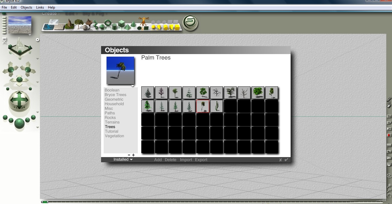 Hole ich den Baum aus der Leiste ondem ich auf „tree“ klicke habe ich irgendeinen Baum in der Szene. Den kann ich zwar über das „E“ editieren aber wenn ich z. B. eine Palme haben will so muß ich hier erst wieder von vorne anfangen. Geht das nicht einfacher, so nach dem Motto klick auf die Palme und die Palme ist in der Szene?