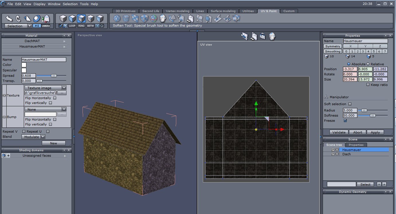 Die geht ums Texturieren. Ich wollte Probeweise eine Fläche mit einem Schindeldach texturieren. Ich hab dazu einen Würfel gezogen, ein Dach gemodelt, auf diese Fläche wollte ich die Schindeltextur drauf machen. Die textur habe ich zwar bekommen, aber viel zu groß und über das ganze Haus, das ich mit einer Ziegeltextur versehen wollte.