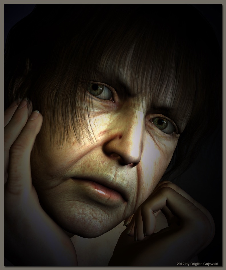 Altes Gesicht und junge Hände wären auch nicht optimal. Deshalb weniger Displacement im Gesicht und Abdunkeln im unteren Bildbereich.