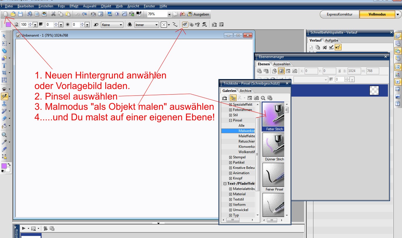 Alternativ gibts die von Kushanku schon erwähnte Möglichkeit, direkt als Objekt zu malen, dies wird aber schnell frustrierend, da diese Möglichkeit besonders bei größeren Bildern schnell die Performance in den Keller schickt.