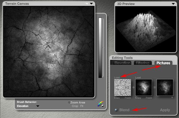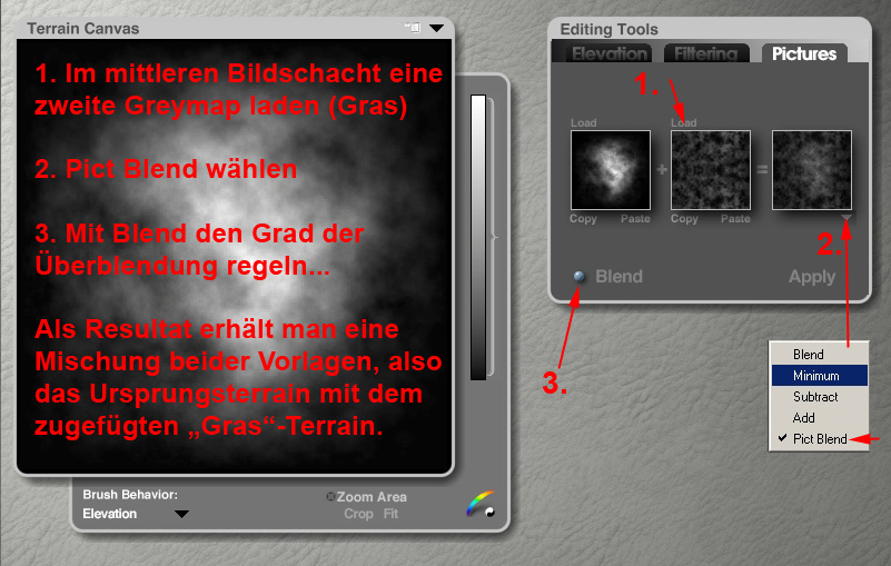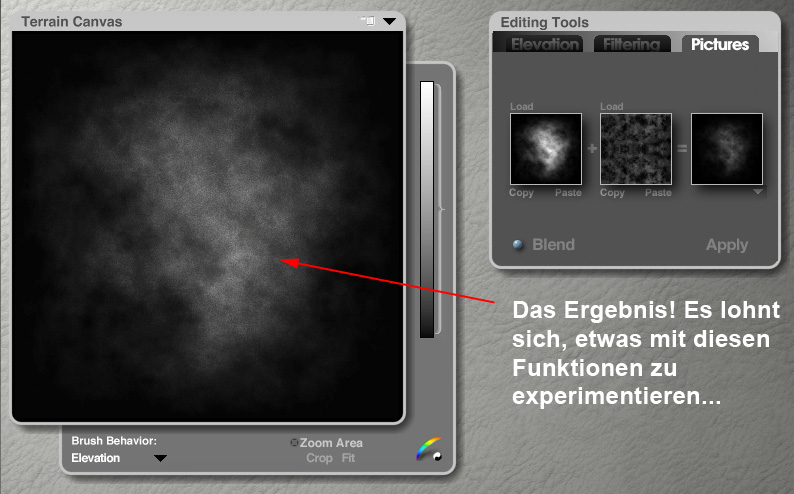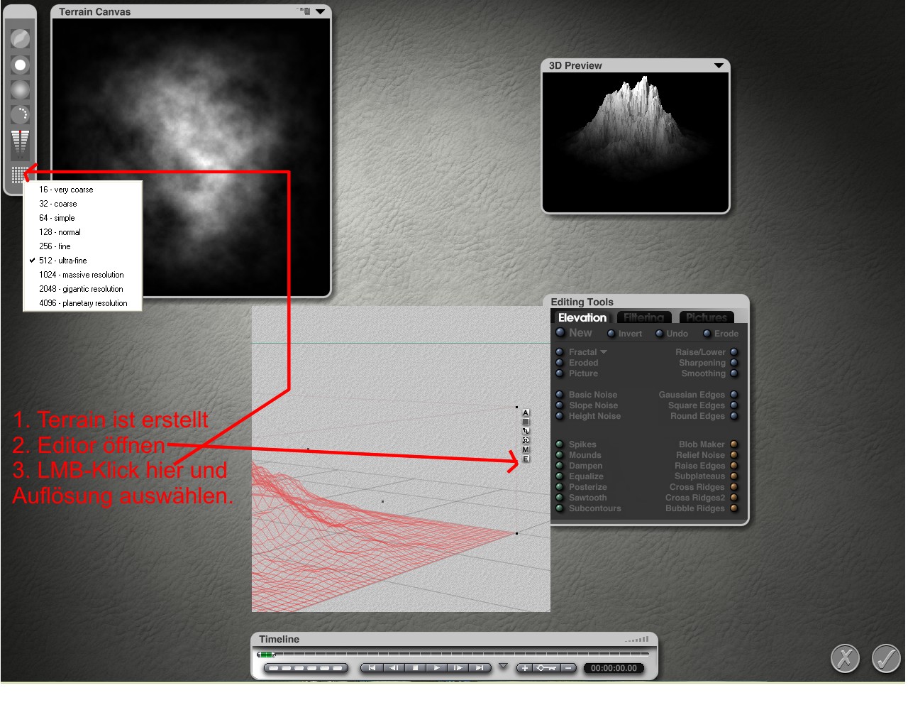 Wenn letzteres der Fall sein sollte, erstens so verfahren, wie Kushanku gezeigt hat. Die Auflösung im Terrain Editor auf mindestens 2048 stellen, dann erst exportieren und in PS weiter bearbeiten. Alternativ: direkt von Anfang an in PS das Terrain anlegen, z.B. 2 Motive, eines für den Berg und ein zweites für den Wald. Beide Bilder als 16 bit Graustufe speichern und in den Bryce Terrain Editor holen (ergibt viel mehr Detailreichtum als bei gewöhnlichen 8 bit Greymaps).