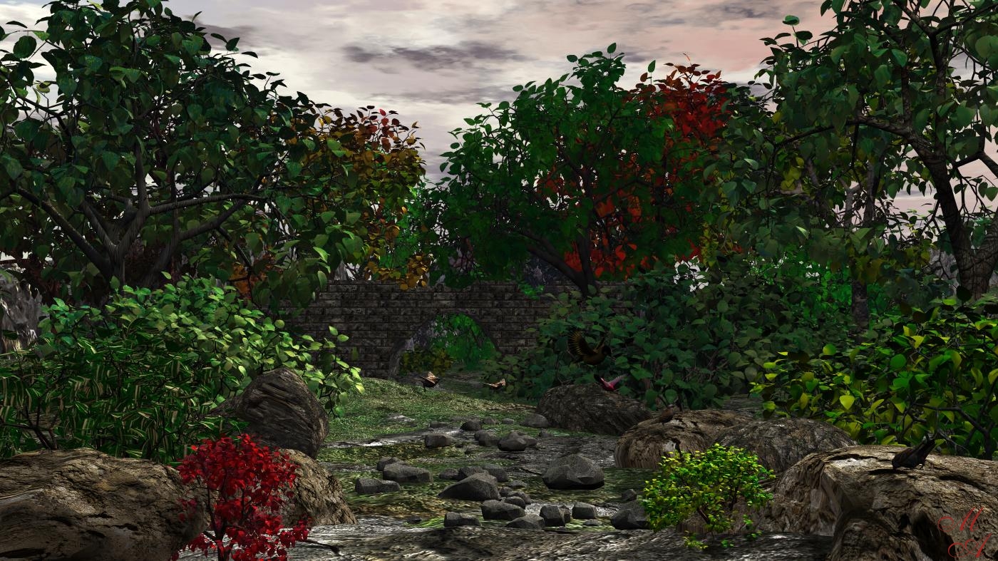 Die Textur der Steine ist hier bis auf eine Ausnahme ganz gut gelungen. Die Rinde der Bäume könnte etwas mehr oder auch eine andere Struktur vertragen und die Blätter vielleicht um einen Tick kleiner und dichter. Das ist jetzt mein Eindruck.