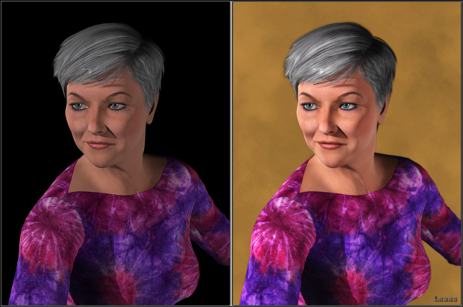 Beim PW von Laila musste ich mehr machen. Farbwerte Schatten und Glanzlichter hab ich auch gemacht, aber hier war das vorrangige Problem das Shadow Bias von DS. Wenn man zu viel daran herumspielt, hält sich das Licht selbst Schatten, aber oft werden Wimpernschatten zu weit vom Auge weg gerendert, sodass Lücken entstehen. Sieht behämmert aus. Also musste ich die Augen doppelt rendern und einfügen. Ich habe auch der Kette mehr Tiefe durch Schatten gegeben.