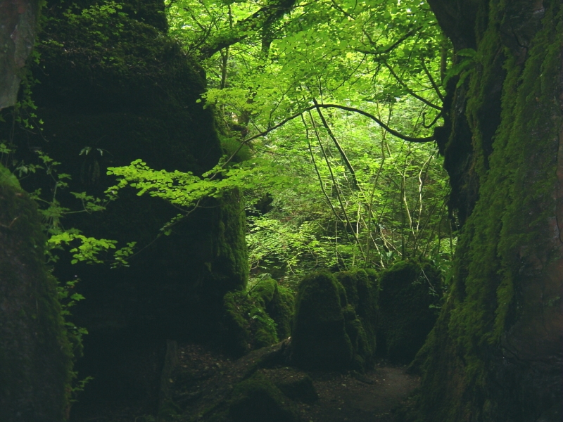 Das Foto habe ich vor vielen Jahren im Forest of Dean (in der Nähe von Gloucester, soweit ich mich erinnere) in England aufgenommen. Das ist ein kleines Waldstück (genannt Puzzlewood; müßt mal nach Bildern googeln, gibts einige) voller bemooster Felsen, uralter Bäume und wunderschöner Laufwege, kostet auch Eintritt.