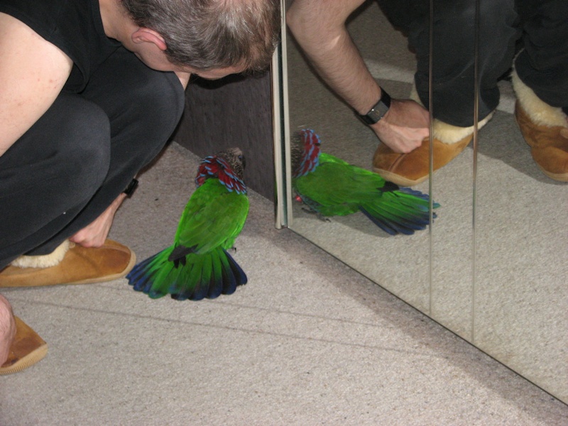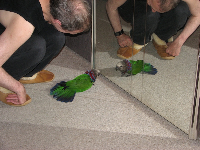 Suserich, neugierig, wie sie nun mal sind die lieben Kleinen, flog meinem Gatterich ins eigentlich verbotene Menschenschlafzimmer nach - dort daselbst landete er auf dem Boden just gegenüber dem grossen Spiegel vom Kleiderschrank. Ja Eiderdaus! Da ist ja ein fremder Genosse in meinem Reich!!! entdeckte er sofort und begann dann mit geschwellter Brust aufgestelltem Kragen und gespreizten Schwanzfedern seine Testosteronparade vor dem Spiegel, um den vermeintlichen Eindringling gehörig zu imponieren und ihn zu verscheuchen.