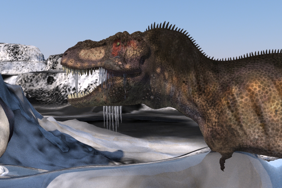 2 Stunden rechnen lassen, dann abgebrochen. Das Eis wäre evtl. noch etwas besser geworden. Habe als Material "Glas" eingestellt dafür und den Dino auf matt gesetzt.