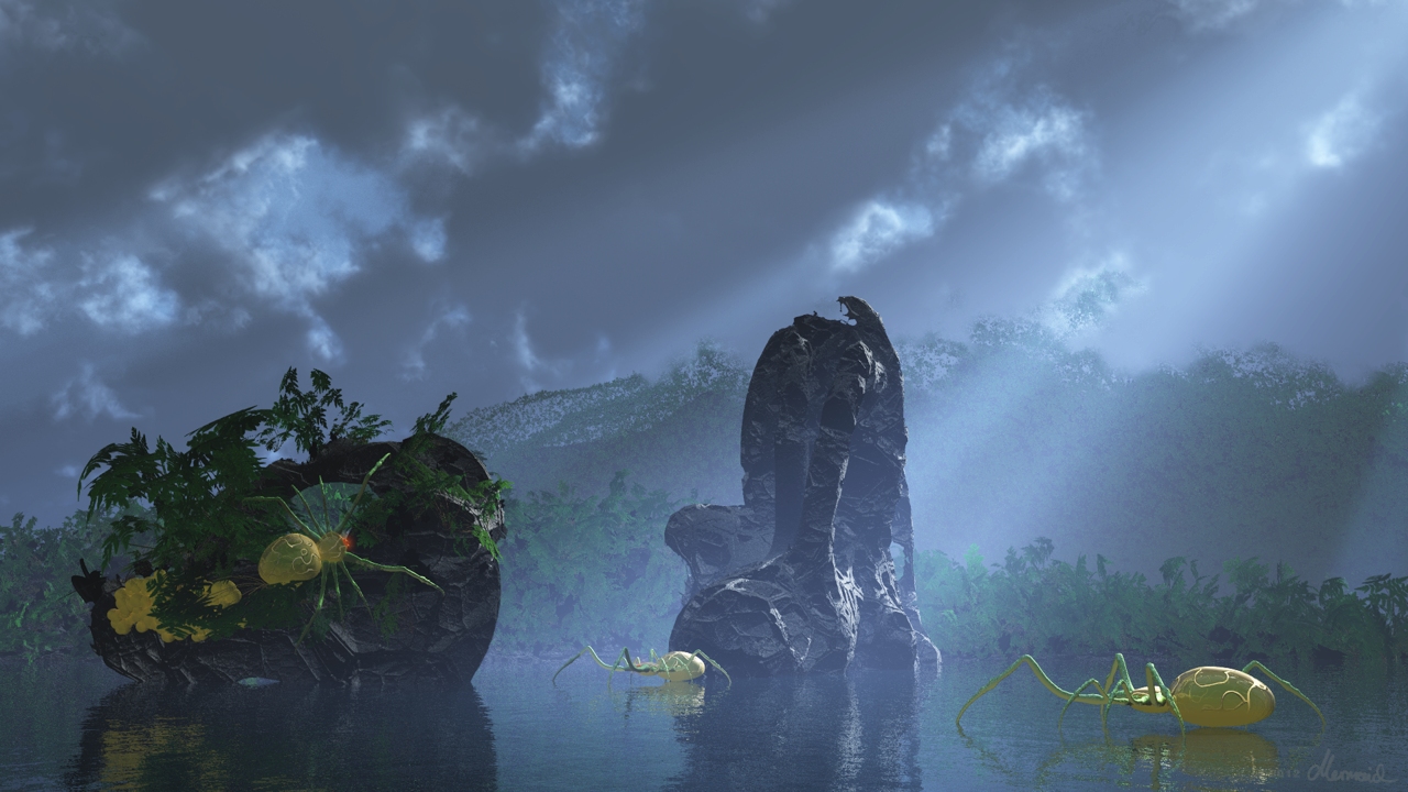hier sozusagen in ihrer Kinderstube. Diese besondere Art legt ihr Eier nur auf den mit Farn bewachsenen Spinnenfelsen im seichten Wasser des Kaorum Sees. Die Hügel ringsum sind mit ihren einzigartigen aus Farnpflanzen gebauen Netzen überzogen, so dass sich kein Fressfeind nähern kann ohne sie zu alamieren...