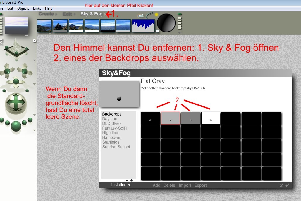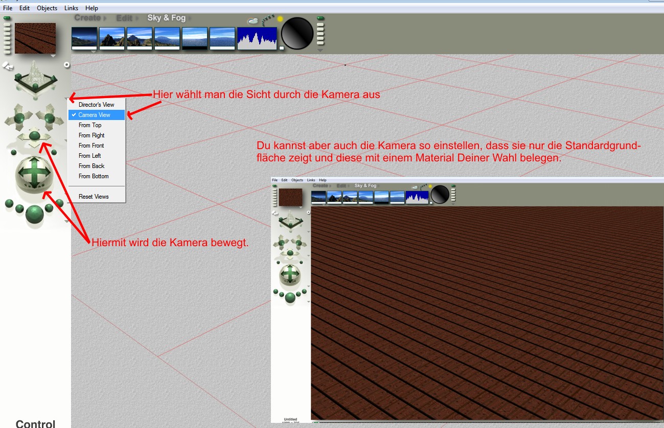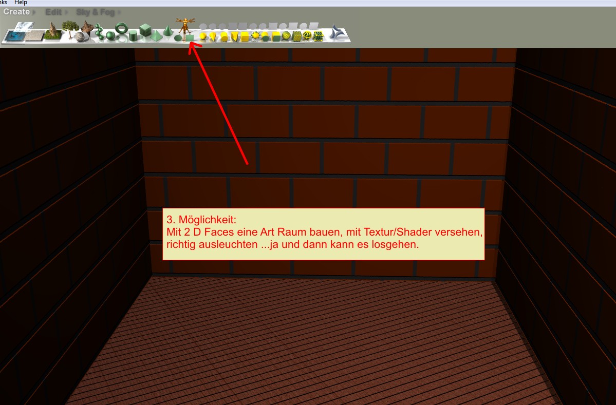 Hab was ähnliches gefunden Weltall das klappt aber ich mag kein Weltall machen sondern das ganze soll ein Fussboden sein und bei Weltall finde ich nichts wie ich da eine Textur oder Material draufsetzen soll und bei der Grundplane hab ich immer noch Himmel den ich nicht los werde.