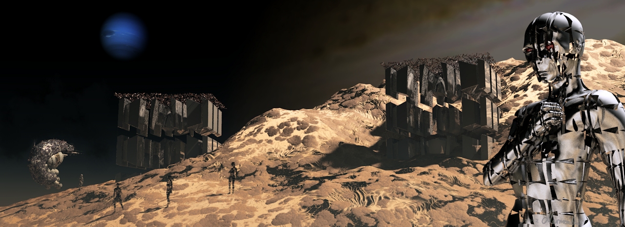 nun habe ich von den texturen keinen plan. aber die welt hat was phantastisches, leichtes. obwohl sie kühl und karg wirkt. der cyborg vorn rechts erscheint für mich sehr filigran und emotionslos.