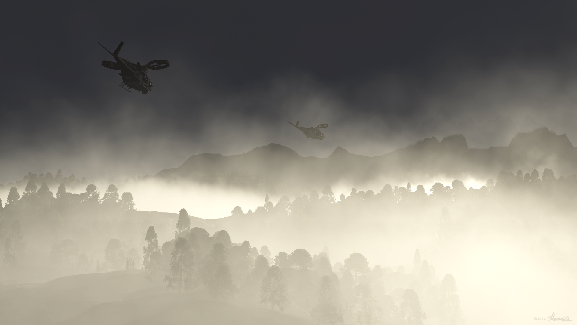 Das ist gar nicht als Nachtaufnahme oder sonst reales atmospherisches Bild gedacht, weil dafür ist es wirklich zu undefiniert im oberen Bereich, und der Nebel ist auch viel zu leuchtend für irgendetwas Reales.... ich fand einfach den Kontrast sehr schön und hab mich über die recht detaillierten Konturen der Bäume gefreut und dann in den undefinierten Himmel noch eine Futuristischen Heli zur Auflockerung gesetzt und fertig war die Laube ![]()