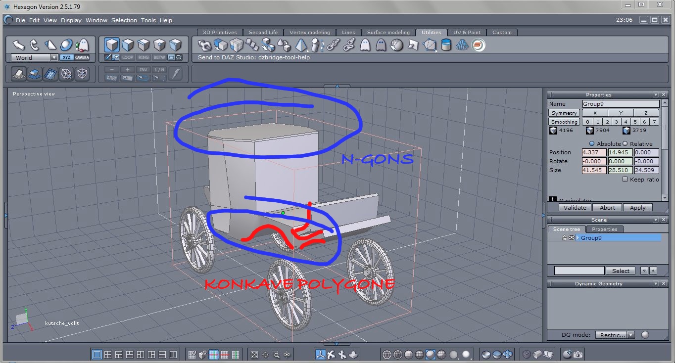 als Prob habe ich in scene tab mehrere Objekte aus der Gruppe wie in hex, aber Wirrwarr ist trotzdem. Ich habe jetzt die Kabine weggenommen, liegt wahrscheinlich doch an den Polygonen hmmm..