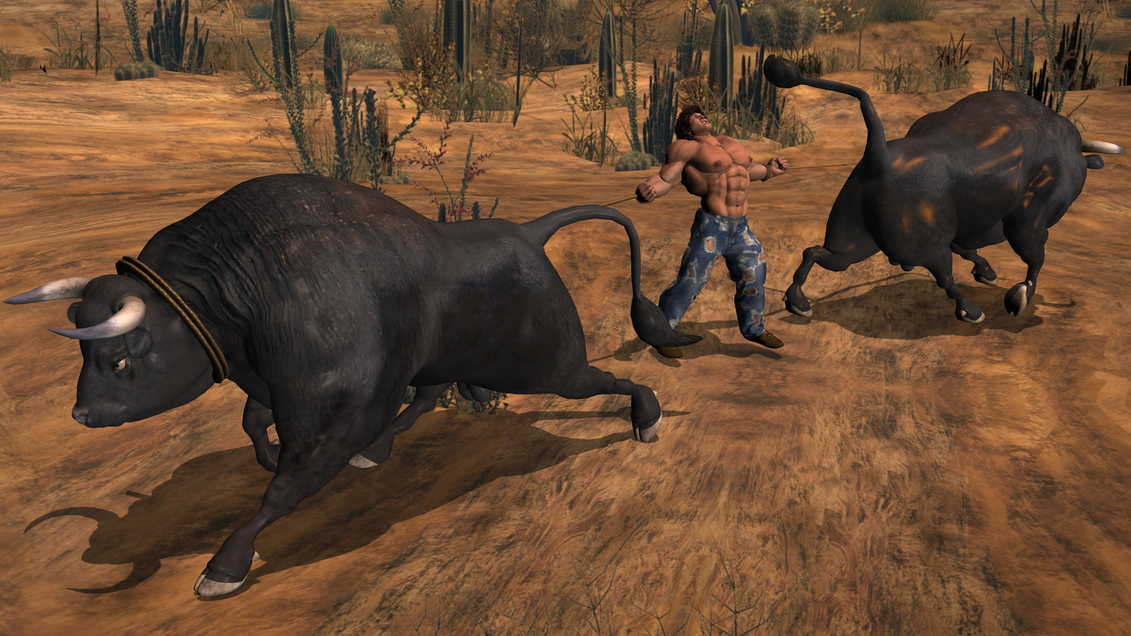 Der Bulle auf der linken Seite hat noch Glück... mit rechte Hufe... Kaktus in der Mitte wäre schmerzhaft