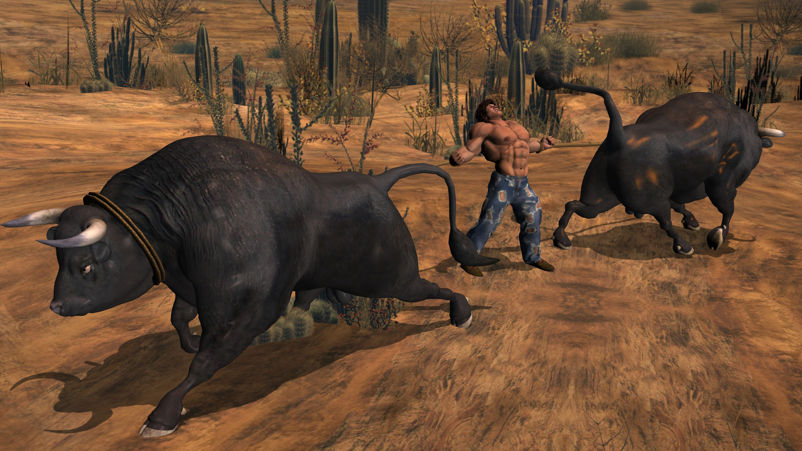 Der Bulle auf der linken Seite hat noch Glück... mit rechte Hufe... Kaktus in der Mitte wäre schmerzhaft