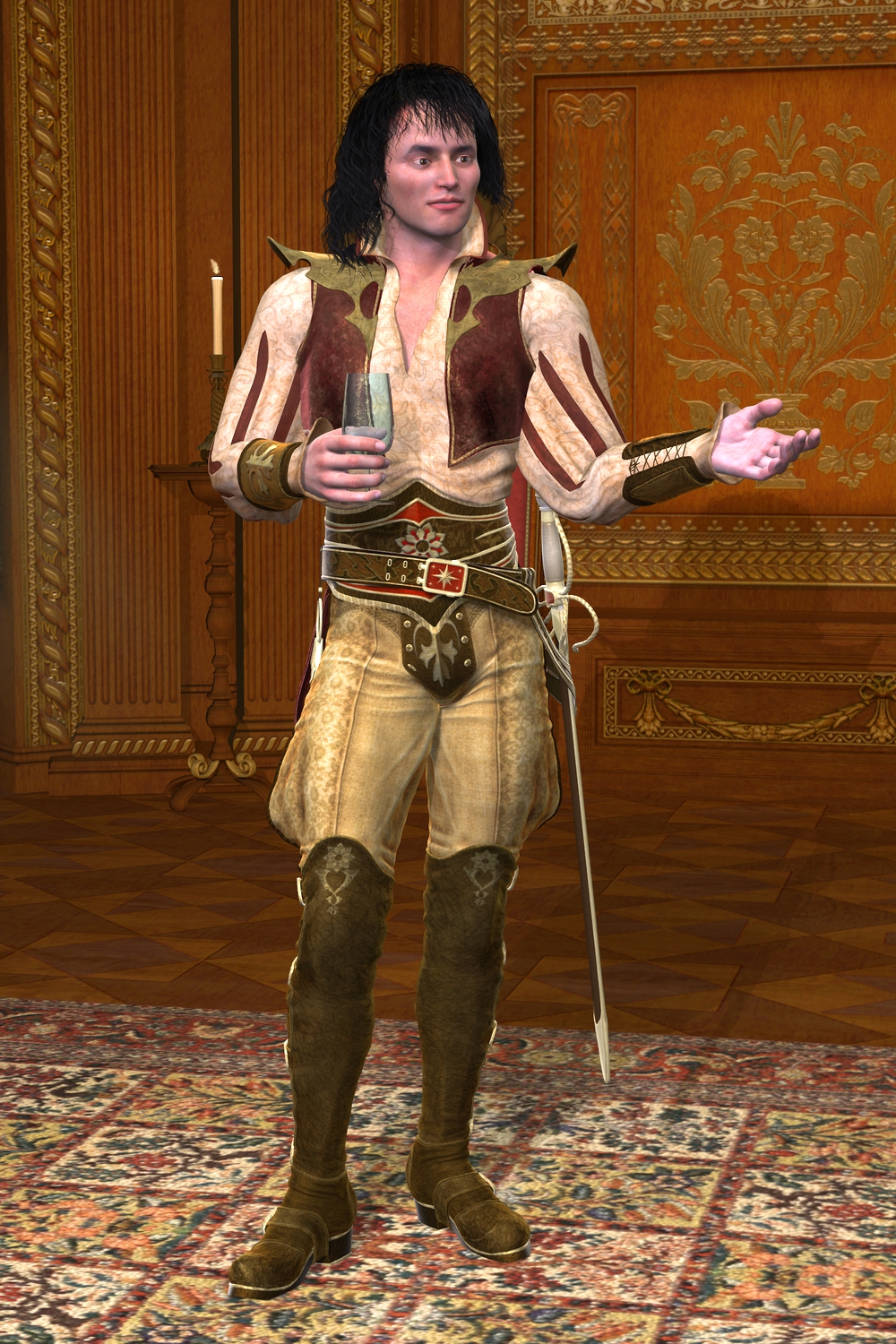 Ansonsten ist er ein ziemlich typischer Adeliger - ein wenig herablassend zu allen nicht seines Standes, aber durchaus auch gönnerhaft und zugänglich, wenn man ihm schmeichelt und ihn mit dem Respekt behandelt, den er glaubt zu verdienen. Seine Moralvorstellungen sind ... locker... freundlich gesagt. Viel trennt ihm nicht von denjenigen, die auch hauptberuflich Dinge sammeln, und sich meistens "Umverteiler der weltlichen Dinge" nennen. Mit seinem Bruder (einem Paladin bei der Stadtwache) hat er in dieser Hinsicht nicht allzu viel gemein... unter anderem wohl auch, weil er sich gerade in der Kindheit häufiger in den Gassen rumgetrieben hat als in der Schule (wo ihm eigentlich alles zuflog und dementsprechend alles viiiel zu langweilig war). Die Freunde, die er dort gefunden hat, waren wohl weniger das, was Mama und Papa als "standesgemäß" empfunden haben, und was sie ihm beigebracht haben, kommt ihm zwar in seiner Berufung zugute (abgeschlossenes Schloss, nettes Schloss, offenes Schloss...), ist jedoch oft nicht mehr auf der legalen Seite des Lebens gewesen.