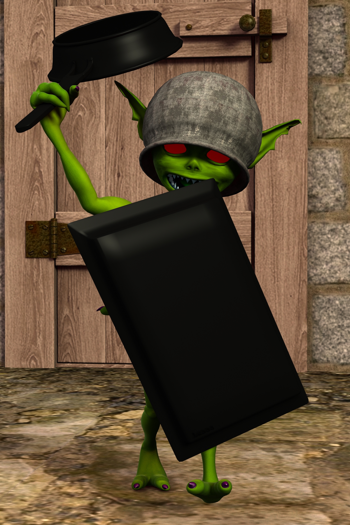 Mit einer entschlossenen Geste stülpte er sich den Kessel über den Kopf, nahm das Backblech an den beiden Schlaufen, die er daran gemacht hatte, an seinen linken Arm und drehte sich mit der Pfanne in der Hand zu den Streitsuchenden um.