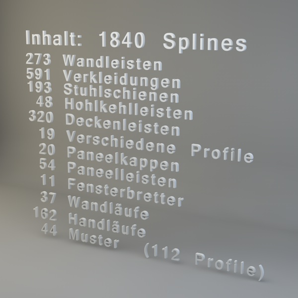 Die Bibliothek ist eine umfangreiche Sammlung von ArchitekturprofilenCinema 4D ab R12. Sie funktioniert NICHT in Versionen, die älter sind als R12! Die Bibliothek umfaßt 1840 sorgfältig erstellte, voll editierbare Splineprofile für Handläufe, Wandläufe, Deckenleisten, Bodenleisten etc. Um die Arbeit mit der Bibliothek insbesondere für Innenräume komfortabler zu gestalten, ist ein Ordner vorgesehen, der 1529 Kopien dieser Spline-Profile enthält, die bereits die für Innräume erforderliche Splineorientierung aufweisen. Insgesamt enthält die Bibliothek damit 3369 Spline-Profile!