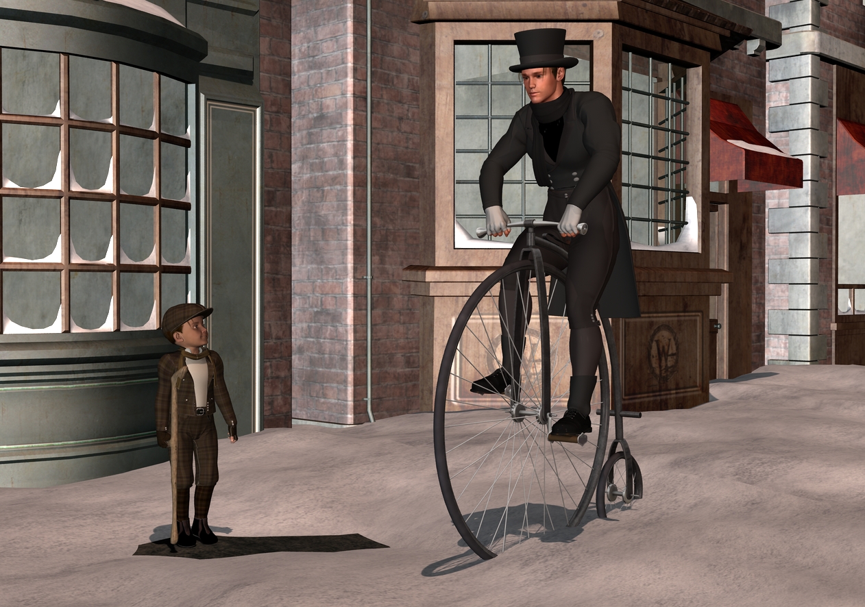 DAZ neues "Old Bike" mit alten Figuren: links Matt in TynyTim-Look und auf dem Rad David3 mit 19thCentury-Clothes in DAZ Victorian Street.