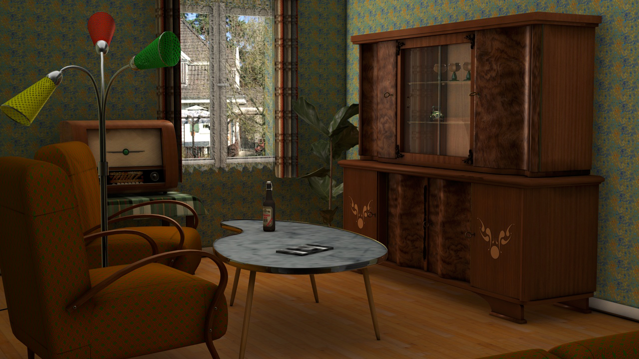 Bis auf den zugegebenermaßen etwas seltsamen Gummibaum ist alles Eigenbau, ach ja das kleine Auto im Schrank natürlich auch nicht. Das Radio befindet sich als Bryceversion im Downloadbereich. -