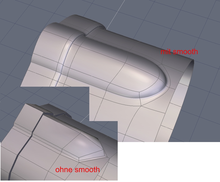 Mit diesen zusätzlichen Edge-Loops (Gewichtungskurven) bringt man Meshes dazu der gewünschten Form zu folgen, da sich Polygone ja nicht verbiegen lassen. Sie müssen an bestimmten Stellen (Rundungen oder nicht scharfe Kanten) dann einfach mehr unterteilt werden. Wenn man den Dreh raus hat, kann man damit super schöne Meshes mit Quadgons erstellen und das mit jedem Polygon-Modeller.