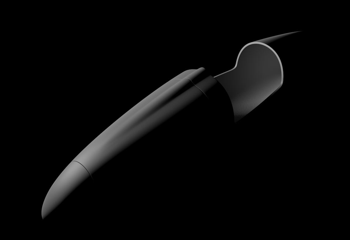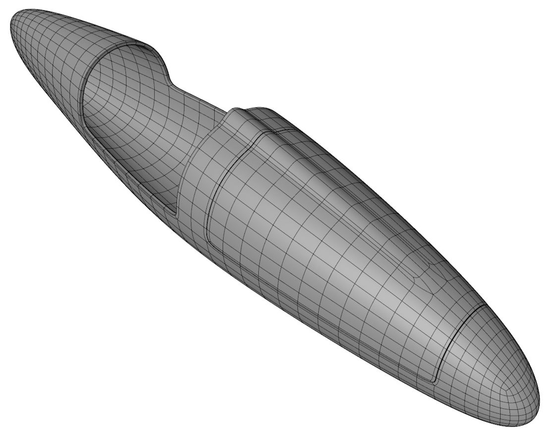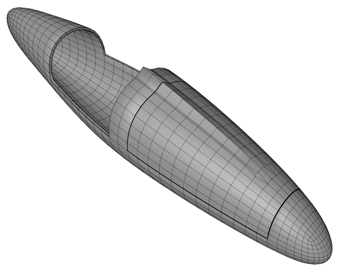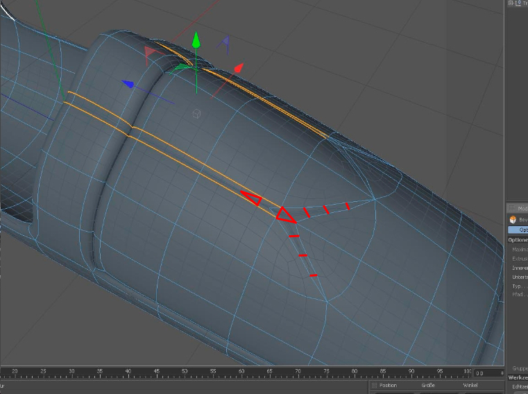 • Nicht ganz einfach, da einen sauberen Übergang hinzubekommen. Müßte der Übergang nicht so fließend sein, hätte ich das Mesh so gemacht wie Kushanku. Ich habe hier nicht mit Beveln gearbeitet, sondern mit dem Messer im Loopmodus, wobei ich die Wirkung des Messers mit "auf Selektion beschränken" auf die Kanten bis fast zur Spitze der Aufwölbung beschränkt habe und die Punkte des Polygons vorne manuell getweaked habe (mit dem Slide-Tool). Das vordere Polygon sollte dabei möglichst planar bleiben. Leider ist das Tutorial modellierungstechnisch nicht besonders und ich habe meine eigene Version des Meshes gemacht. Wahrscheinlich auch nicht ganz optimal, aber der Übergang ist so ziemlich sauber geworden.