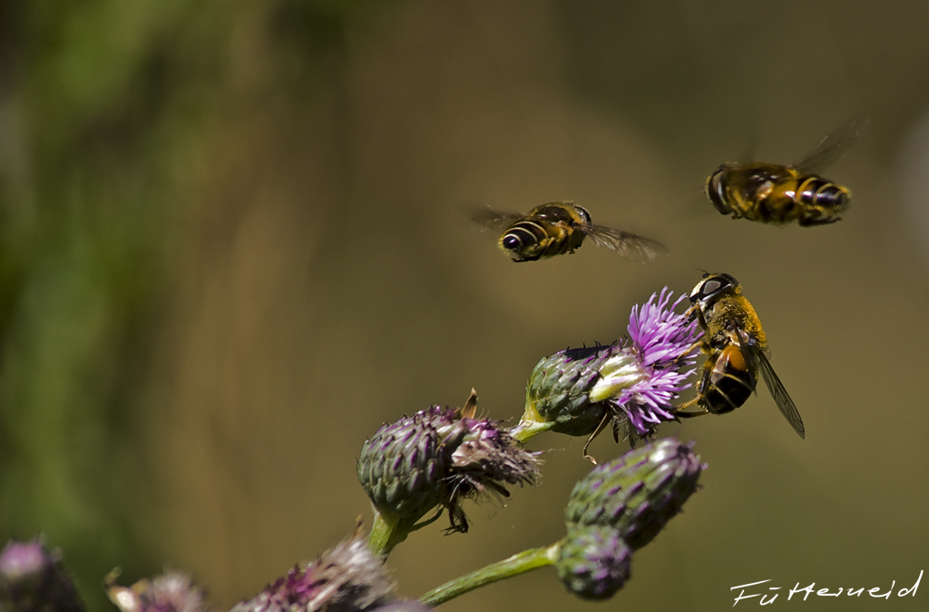 Drei Schwebfligen der Gatttung Eristalis tenax, Scheinbienen-Keilfleckschwebfliege / Mistbiene, haben es auf den Nektar einer Diestelblüte abgesehen, aber schön der Reihe nach, zuerst der Boss, dann das Personal ![]()