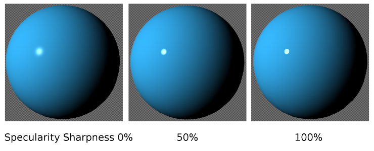 - Specular Sharpness regelt die Schärfe des Lichtpunktes. Während Glossiness die grundsätzliche Schärfe und Größe regelt, wirkt Specular Sharpness nur auf die Schärfe des Umrisses.