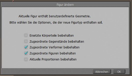 soweit ich das bisher herausgefunden habe, muss ich die kleidung immer der frisch in die szene eingesetzten figur anlegen. die figur darf vorher nicht bewegt werden, nicht gebeugt... da sonst die kleidung einfach nicht anlegbar ist. wenn ich das doch mache, kommt immer folgendes fenster