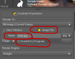 - weiter unten muss man den Pfad und den Namen der RIB - Datei angeben. (Das "R" steht für "Renderman") wo die RIB-Datei schließlich landet. Bei mir in C:\DAZ_temp\3delight_collected. Also: C:\DAZ_temp\3delight_collected\3delight.rib. In den Render-Settings steht dann nur der Dateiname.