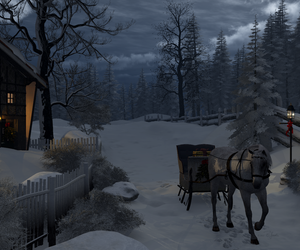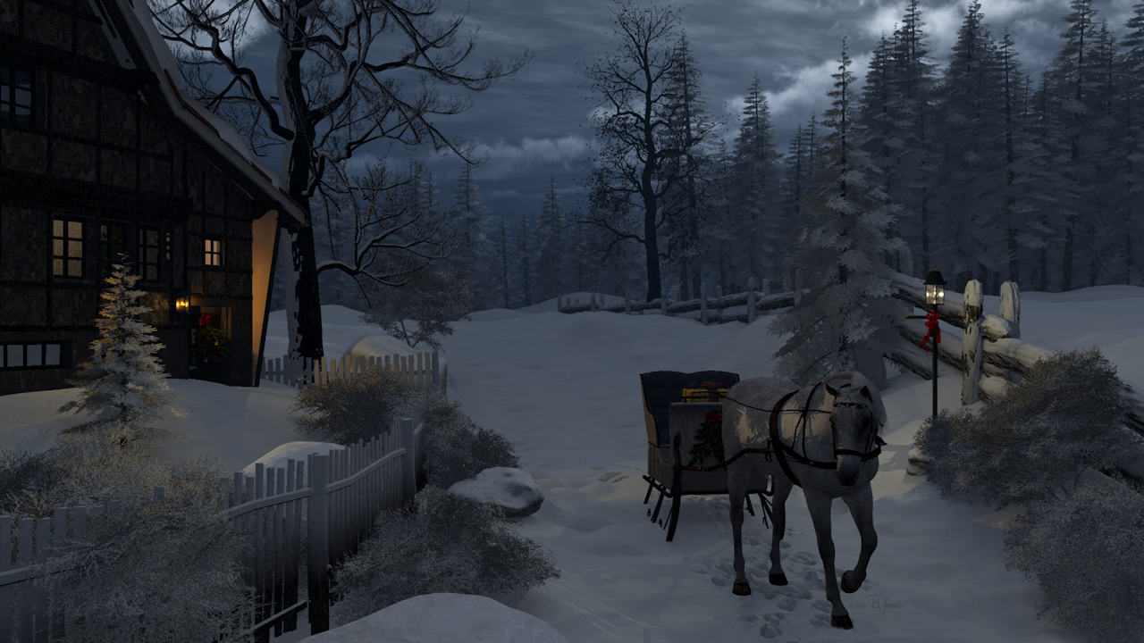 Sollte die Lichtquelle von dem Haus kommen, ist sie viel zu klar; auf der Entfernung müsste sie sich doch längst wieder verlieren. Und was mich ein wenig stört, sind die fehlenden Huf- und Schlittenabdrücke hinter dem Pferd, bzw. Fußspuren zum Haus.