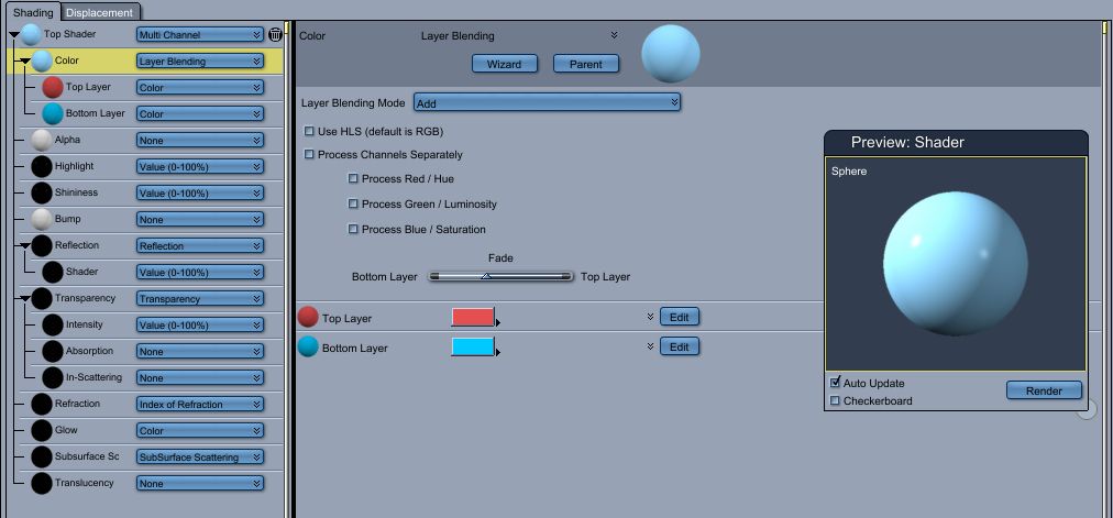 Dies fügt einen "Fade"-Regler, mit dem Sie die Stärke des Effekts einstellen, Begünstigung entweder die obere oder untere Schicht ermöglicht. Es ermöglicht auch Nicht-Farbe Shader verwendet werden.