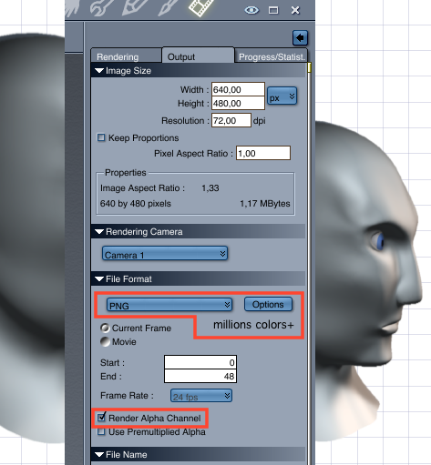B) unter Optionen muss die Farbtiefe dann "Millionen Farben+" lauten, wobei das "+" für den zusätzlichen Alpha-Kanal steht.