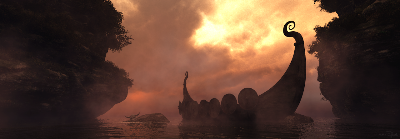 Hab heute nachmittag auf einen Hinweis von Wabe hin eine feine Seite mit Freebies gefunden (http://www.planit3d.com/source/meshes_files/meshes.html) unterem anderen auch jenes wunderbare Vikingerschiff von Helmut Schaub, was ich dann mir sofort in Vue mal angucken musste...und beim Angucken blieb es dann nicht, ich habs texturiert und dann enstand eben jenes Bild in meinem Kopf, was unbedingt raus wollte
