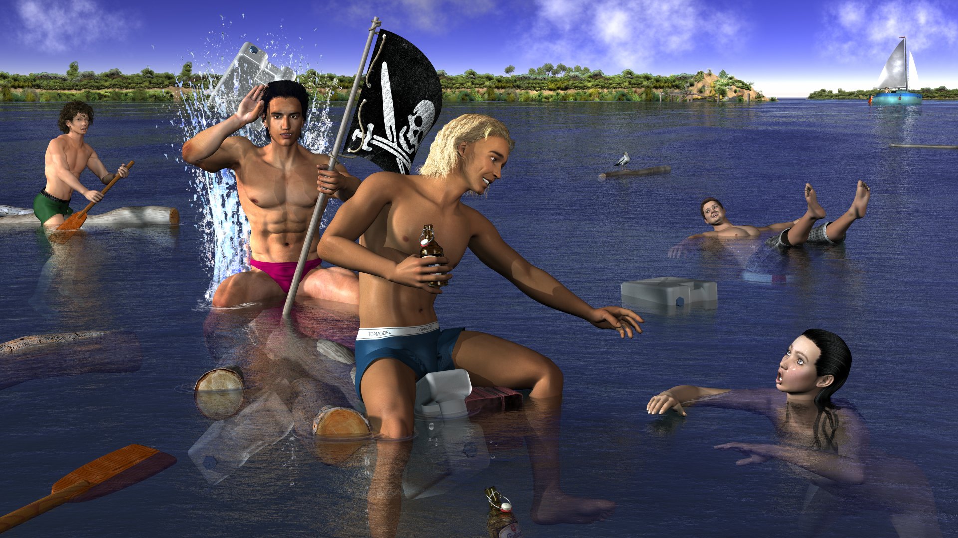Mit Wasser habe ich so meine Schwierigkeiten. Nehme ich zum Beispiel ein anderes, realistisches Himmelblau, dann färbt sich das Wasser auch um.